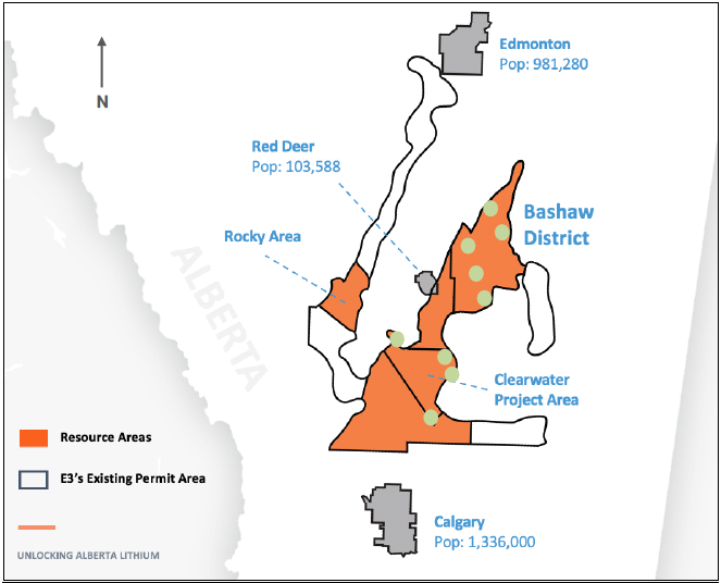 CALGARY, ALBERTA, July 11, 2022 – E3 Lithium (TSXV: ETL) (FSE: OU7A) (OTCQX: EEMMF) (the "Company" or "E3 Lithium" or “E3”), Alberta’s leading lithium developer and Direct Lithium Extraction (DLE) technology innovator today announced the increase in its inferred mineral resource to 23.4 million tonnes of lithium carbonate equivalent (LCE) contained within the newly-named Bashaw District (the “Resource”). The Bashaw District combines and expands the Clearwater Resource and Exshaw Resource areas into a consolidated resource that contains an estimated total of 59 billion m3 (59 km3) of brine formation water at an average grade of 74.5 milligram/Litre (mg/L) lithium (Figure 1).